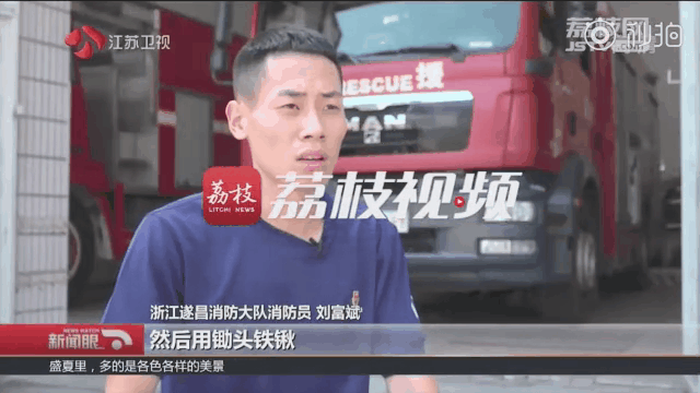 7月30日,浙江遂昌消防員劉富斌接受當地電視臺采訪時,突然火警鈴聲響起,他一把拿下話筒,轉身沖向車庫,穿上戰斗服,不到一分鐘時間,消防車便出動了,迅速趕赴火災現場。